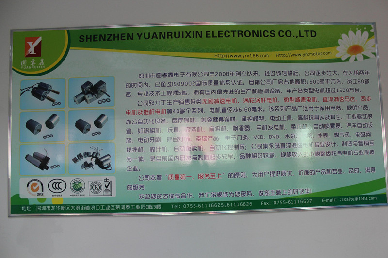 深圳市圓睿鑫電子有限公司自2008年創(chuàng)立以來,經(jīng)過誠(chéng)信耕耘,在為期兩年的時(shí)間內(nèi),已通過ISO9001:2000國(guó)際質(zhì)量體系認(rèn)證。公司廠房占地面積2000多平方米,員工100人,專業(yè)技術(shù)工程師6名,擁有國(guó)內(nèi)最先進(jìn)的生產(chǎn)和檢測(cè)設(shè)備,年產(chǎn)各類減速電機(jī)超過2~300萬臺(tái)。因公司發(fā)展需要,于2020年底,將生產(chǎn)基地遷往擁有最美小鎮(zhèn)之稱的東莞市清溪鎮(zhèn),依山傍水,依托美麗的大自然環(huán)境和地方文化,全新的東莞市圓睿鑫電子有限公司將借助深圳母公司平臺(tái),一步步走上新的臺(tái)階。